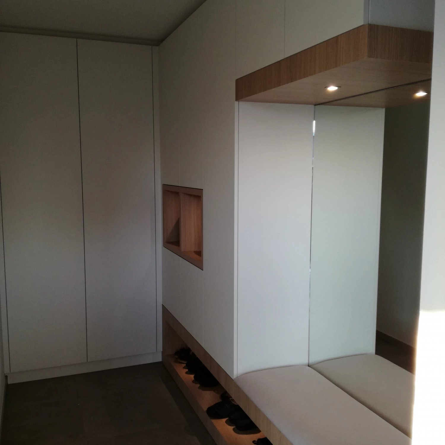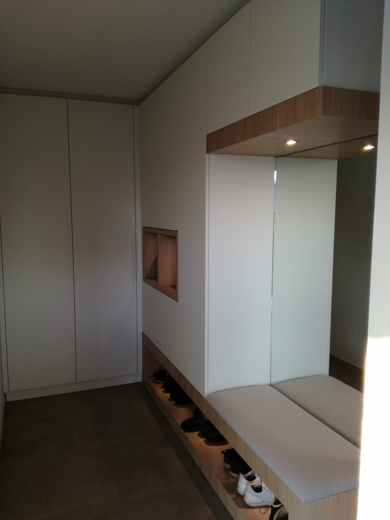 Ook de inkomhal is voorzien met nuttige ruimte op je schoenen te plaatsen en een zitbank. De spiegel alvorens je naar buiten gaat, mag natuurlijk niet ontbreken.