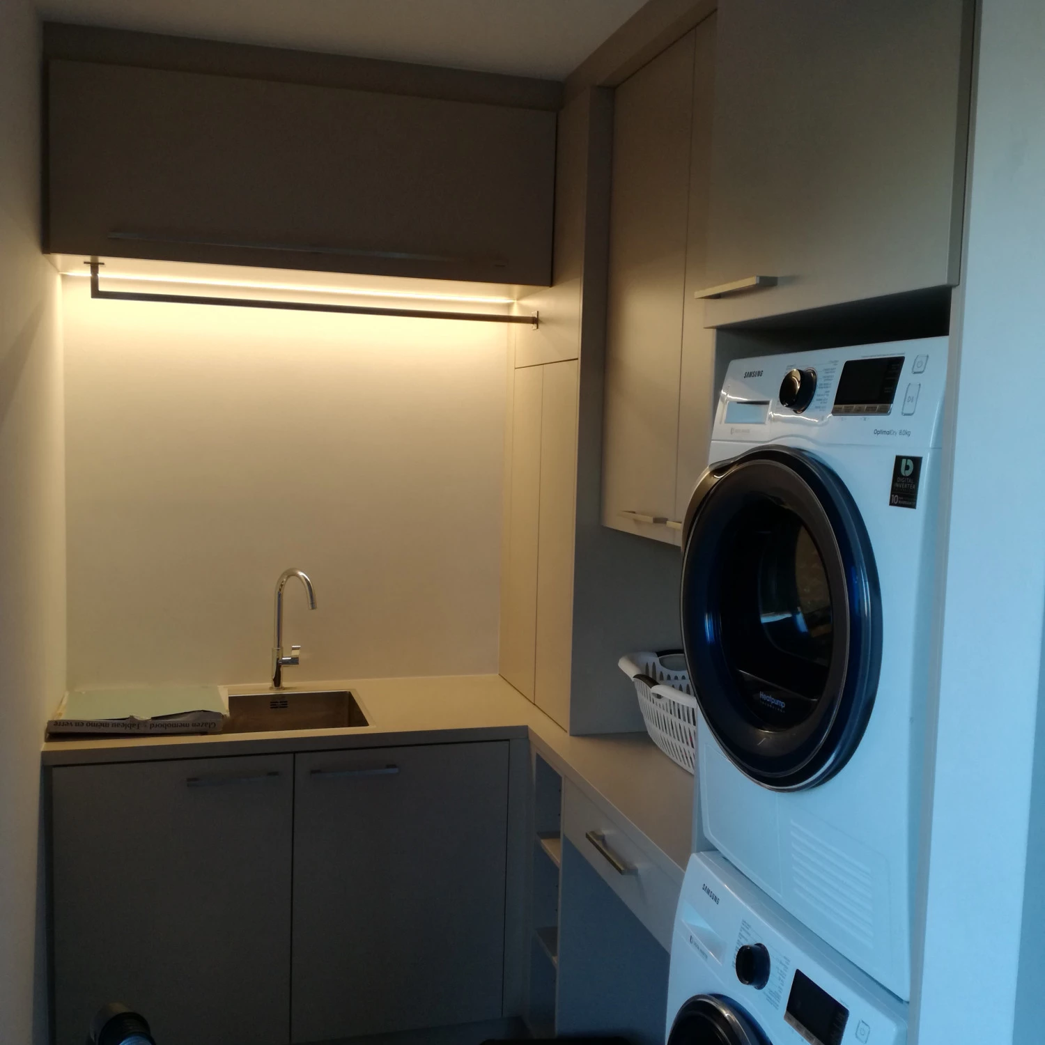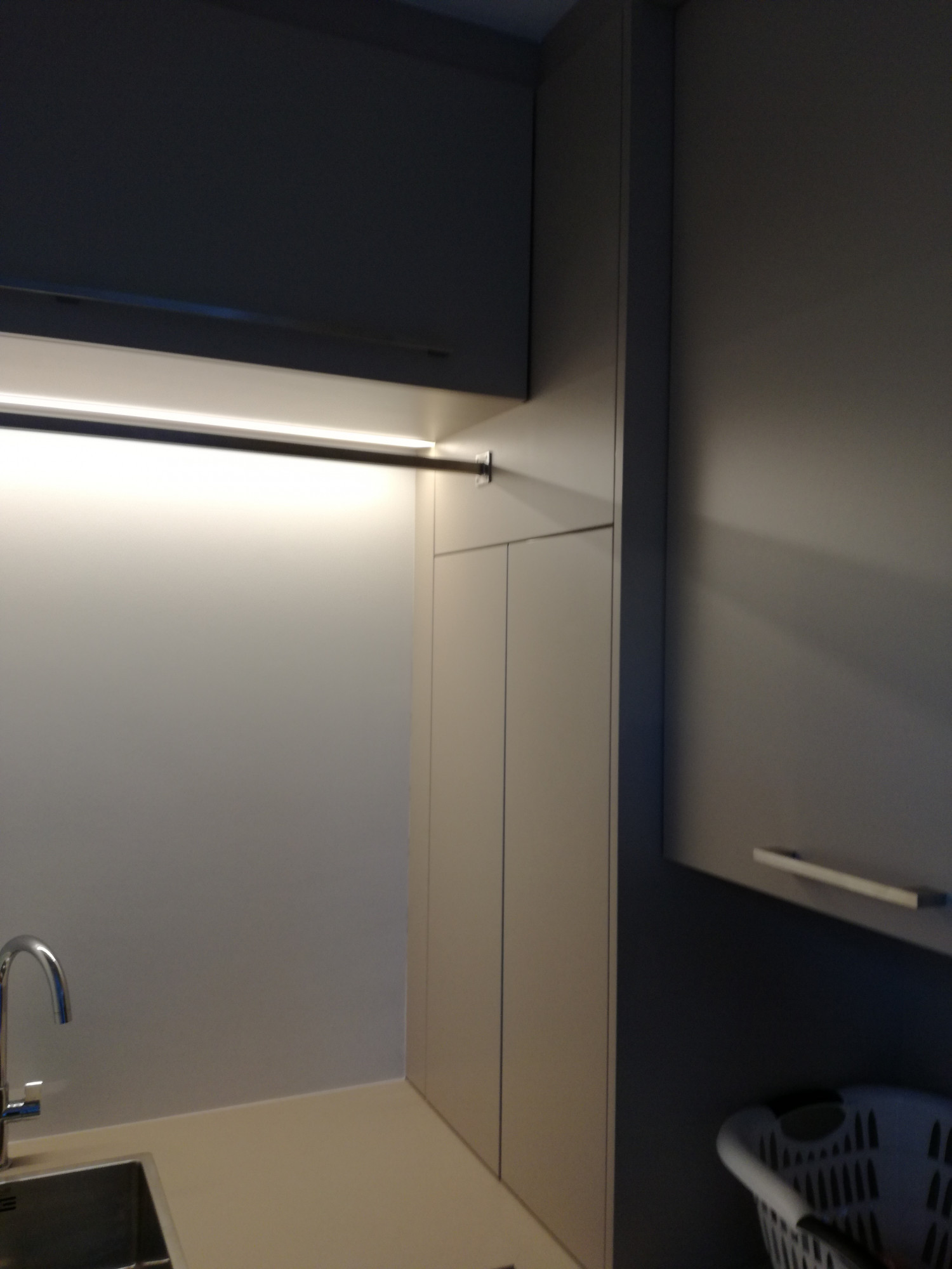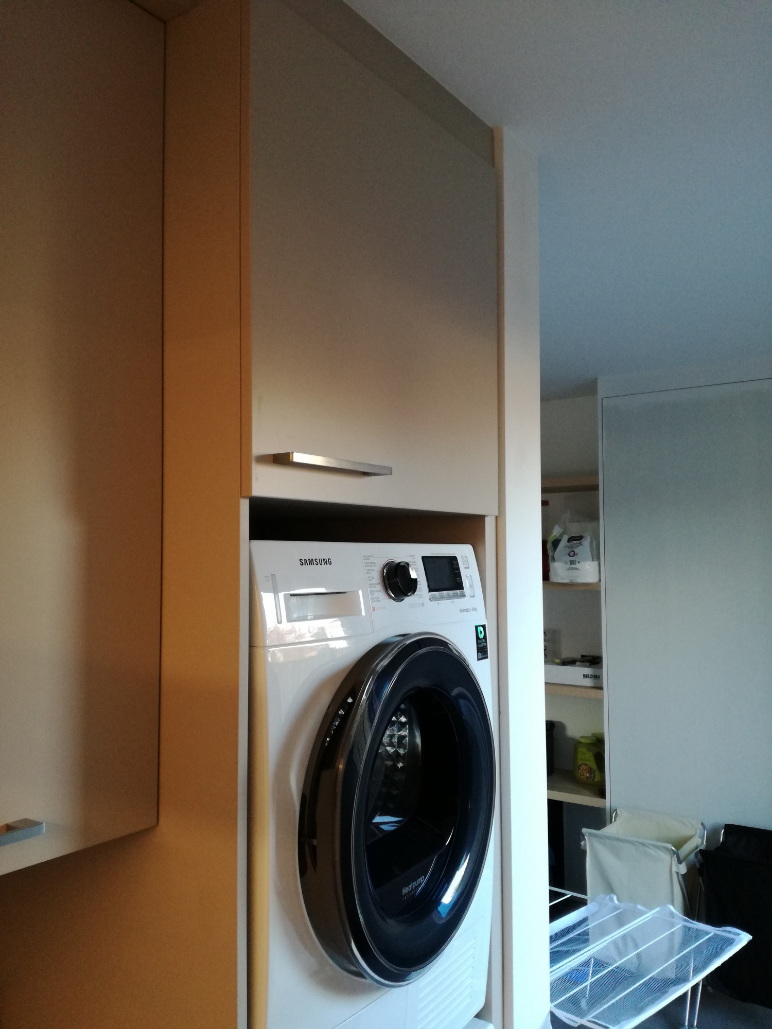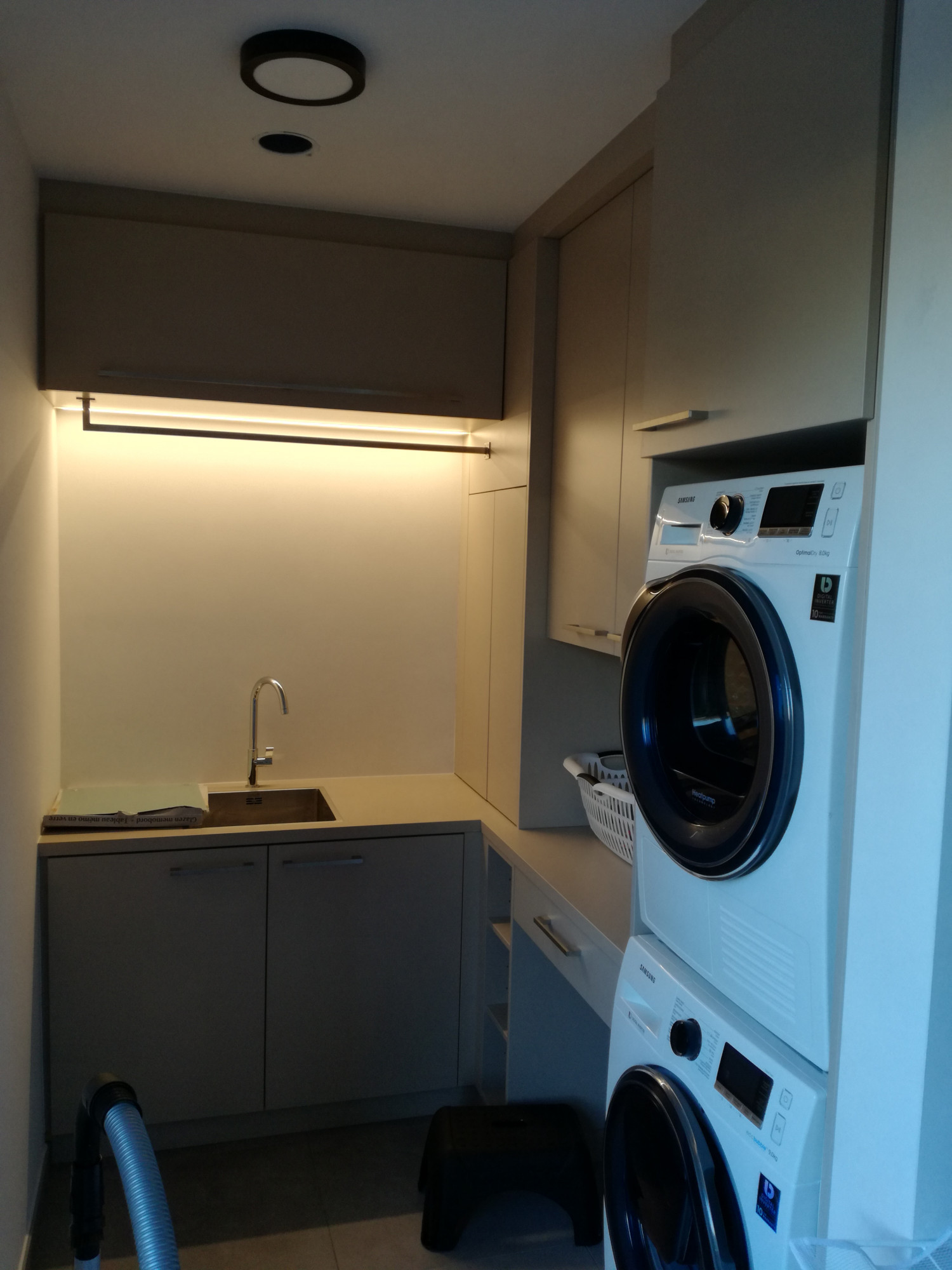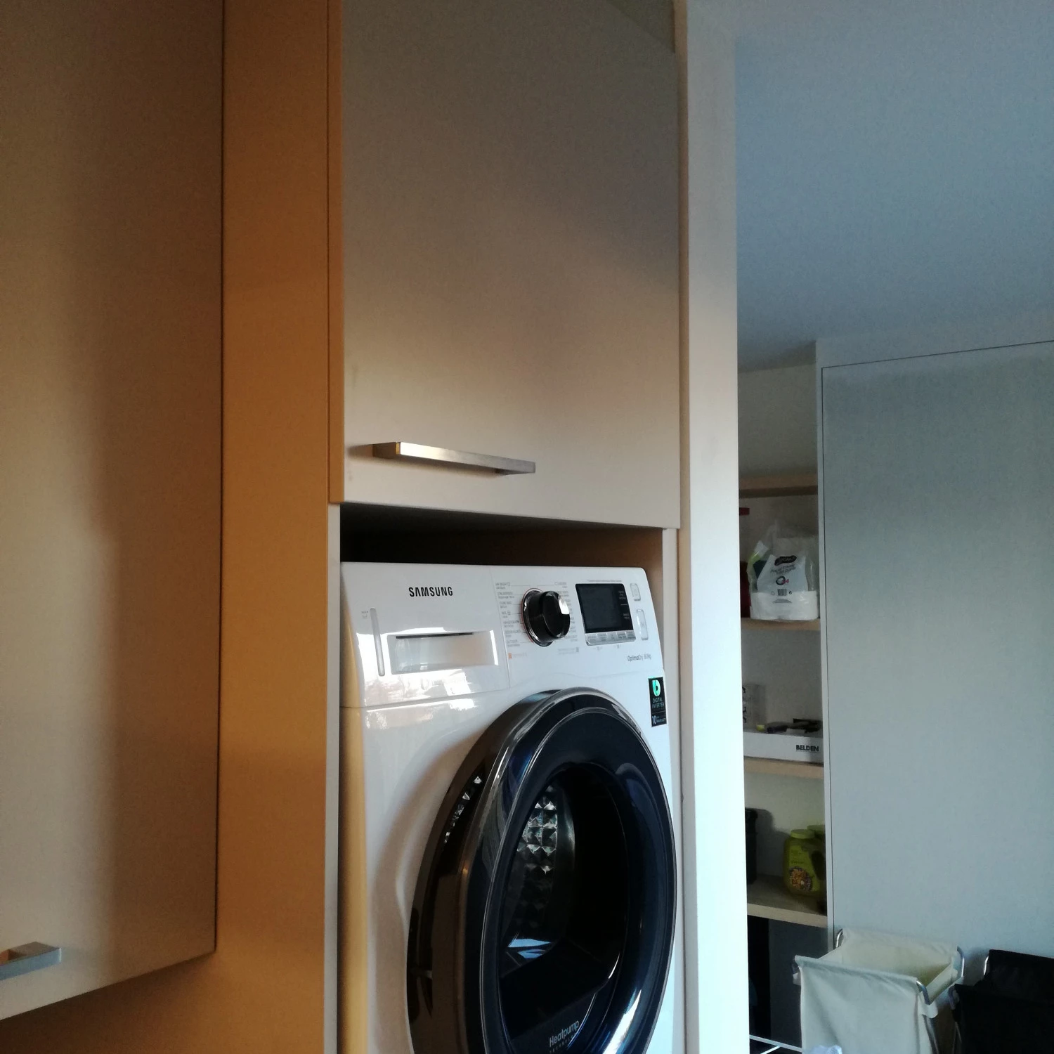 De wasplaats is en blijft een kleine ruimte die we graag optimaal benutten. Hier is de ruimte zo ingericht dat elke ruimte praktisch en nuttig is.